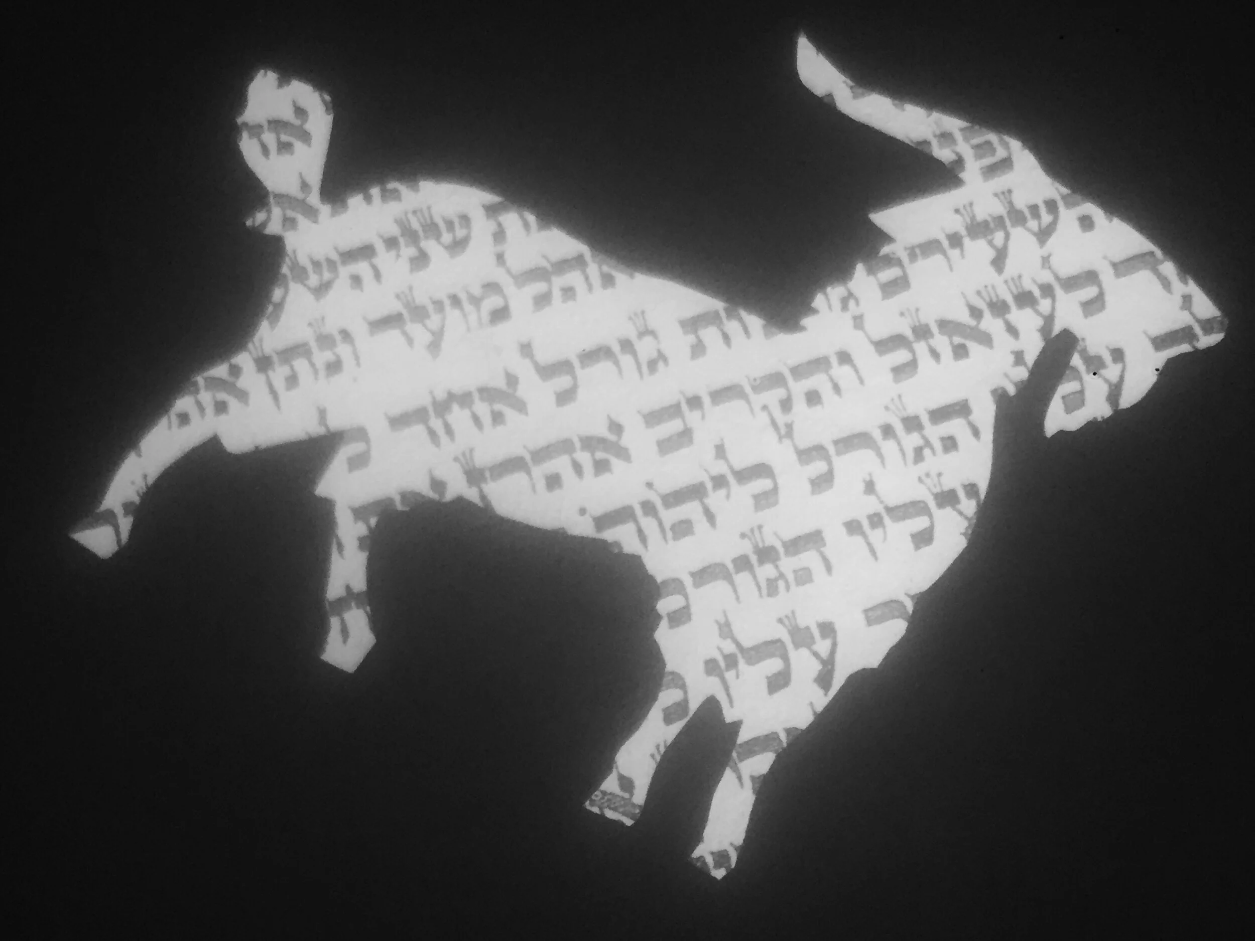 Goat’s Works sheds light on ancient ritual of atonement- literally. Light shines on an overhead projector betweens the text of VaYikra 16. Shadow puppetry animates rabbinic world play. Text turns to image accompanied by traditional music from Mizrahi and Ashkenazi lineages. Giant Hebrew letters circulate in the congregation to hold the weight of our reckoning. The letters reassemble to become the goat that escapes to a mysterious wildness. Goat’s work offers a window into the catharsis of the ancient practice, without asking any goat to labor for us.