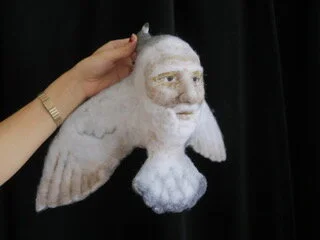 Jonah, in Hebrew Yonah means dove. Just as the reluctant prophet transforms so does the his puppet: His face becomes a dove. His body becomes the boat and then the ocean in which he seeks concealment. The giant fish that consumes him engulfs the audience too, inviting them into his internal reckoning.